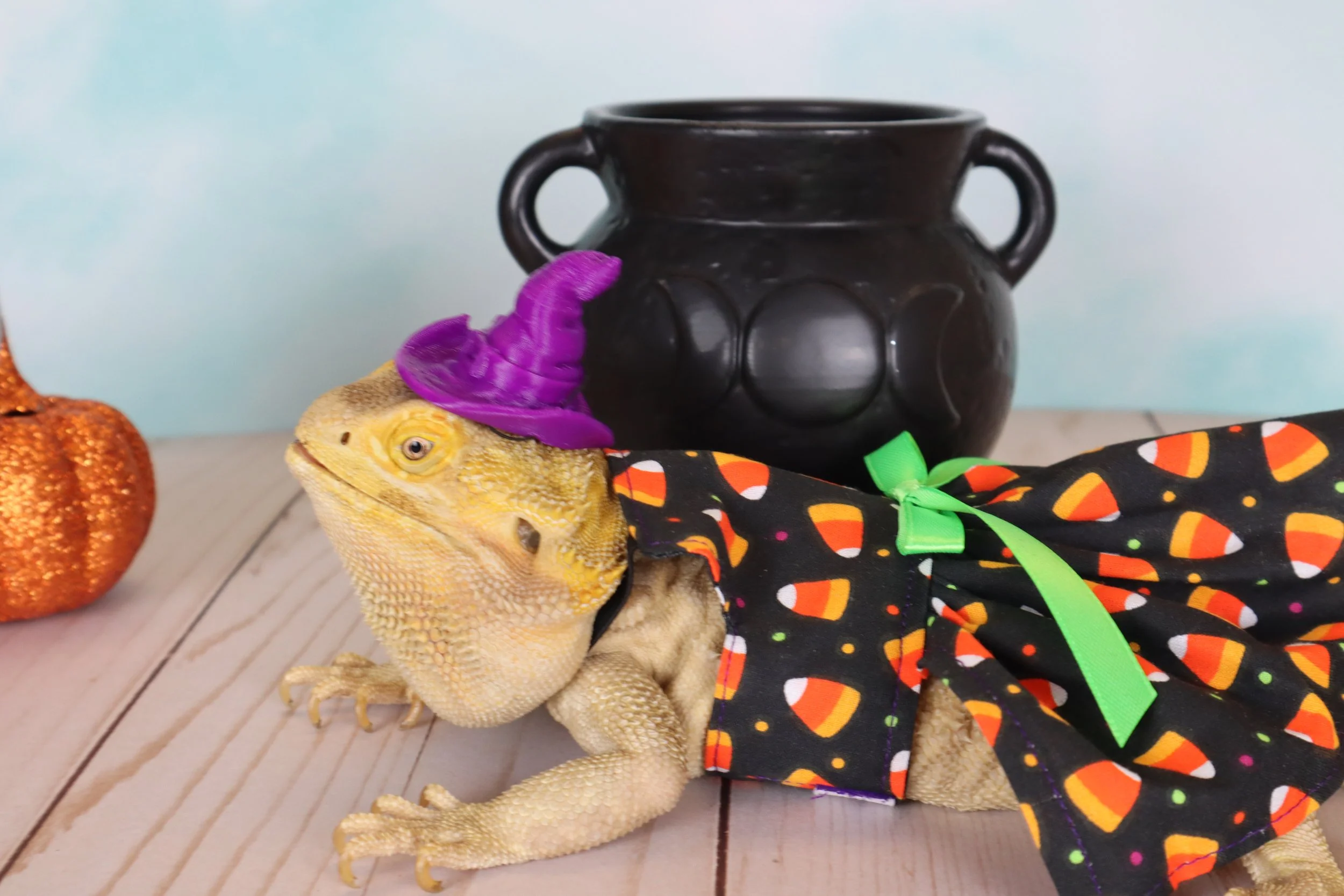 Clementine Modeling the Candy Corn Dress and Witch Hat 2023